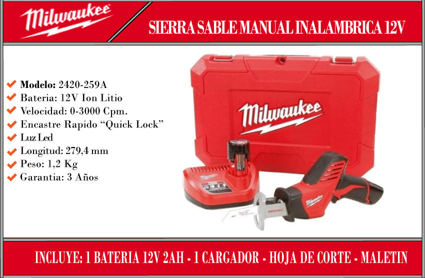 Milwaukee Sierra Sable 12 V 1 Bateria - Cargador - Maletin