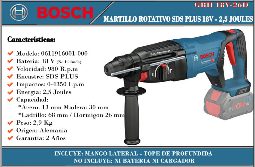 Bosch Martillo Rotativo Plus 18v Gbh 18 V-26d - 2,5 J (sin Bateria - Sin Cargador)