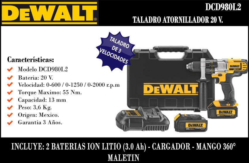 Dewalt Atornillador Taladro 20v 13mm (2 Baterias, Cargador, Maletin)