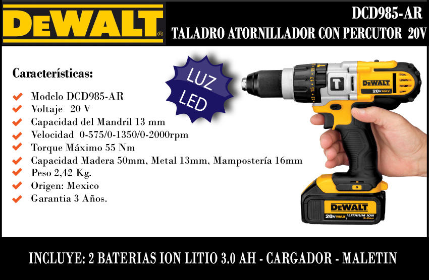Dewalt Atornillador Taladro Percutor 20v 13mm (2 Baterias Cargador Maletin)