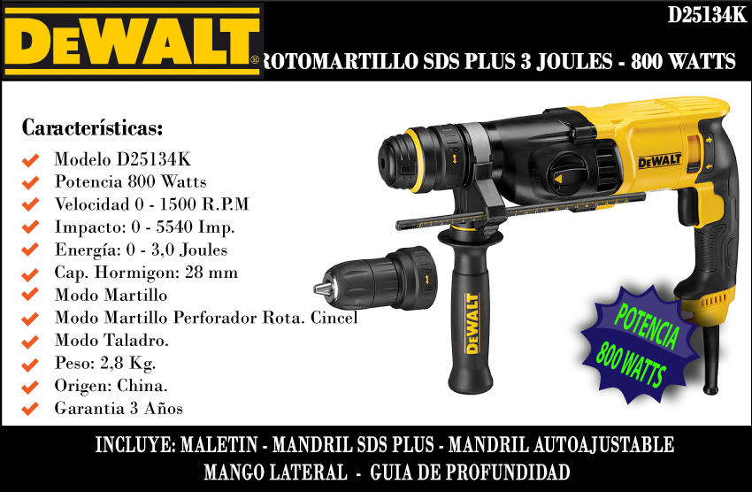 Dewalt Martillo Rotativo Plus D25134k 800w 3,0j 28mm 2mand Reemp. 25124k