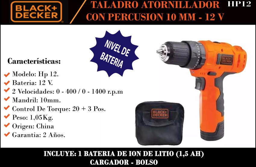 Black & Decker Atornillador Taladro 10mm C/ Per. V.var. Tor 20nm 12v 1bat Ion-lit Carg. + Bolso