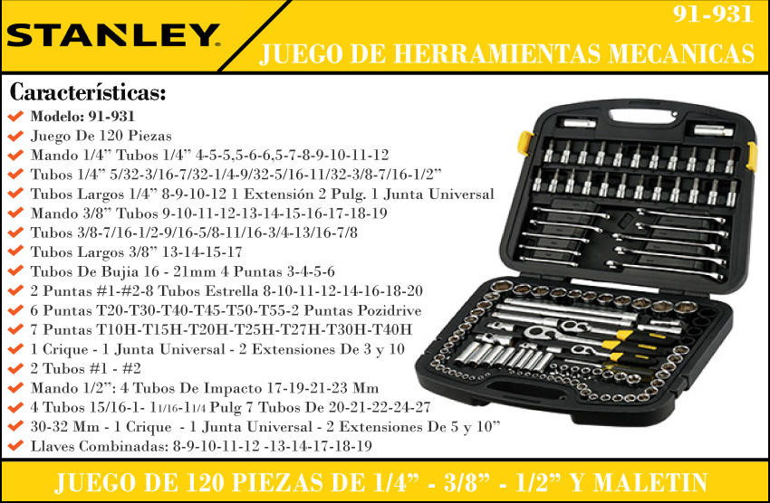 Stanley Set 120 Pzas Bocallaves Enc. 1/4-3/8-1/2 (91-931)