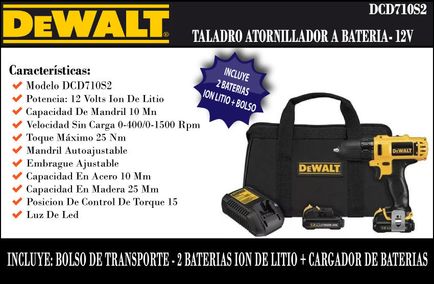 Dewalt Atornillador Taladro 12v 10mm (2 Baterias - Cargador - Bolso)