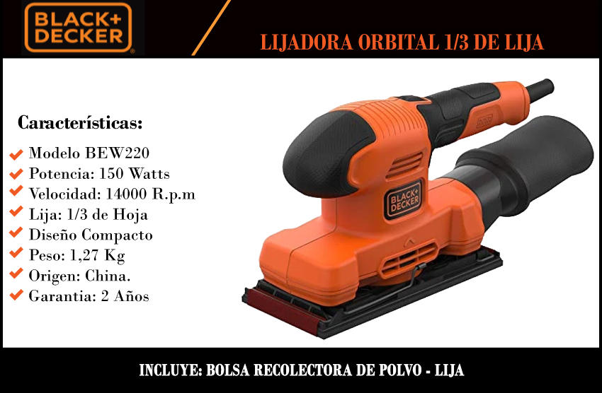 Black & Decker Lijadora Orbital 150 W 1/3 Hoja (ex Cd455)