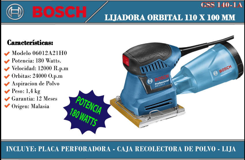 Bosch Lijadora De Palma Orbital 180w Gss140-1 A Recolectora Polvo