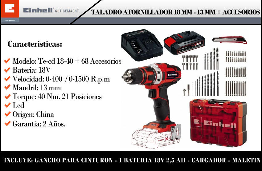 Einhell Atornillador Taladro 18v 13mm Te-cd 18-40 Li + 68 (1 Bateria Y 1 Cargador)