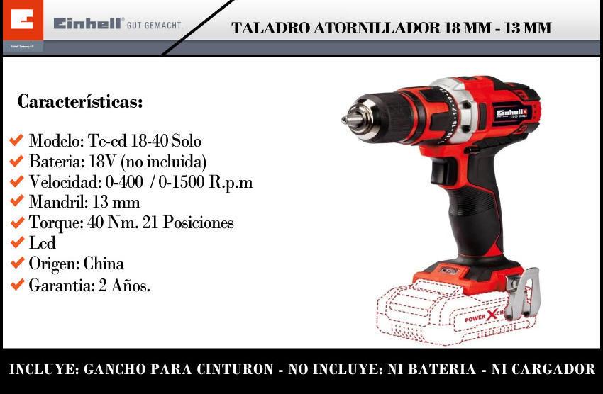 Einhell Atornillador Taladro 18v 13mm Te-cd 18-40 Solo (sin Bateria Y Sin Cargador)