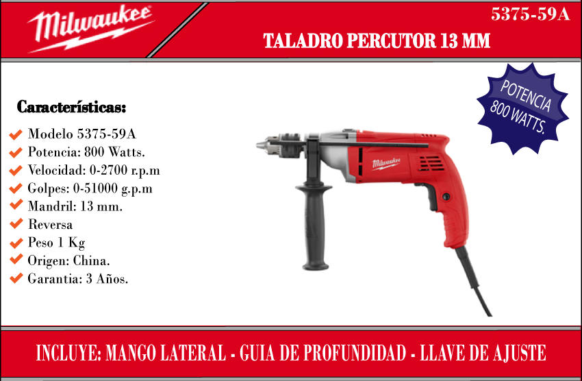 Milwaukee Taladro Percusion 13mm 800 Watts