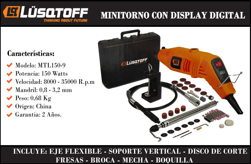 Lusqtoff Minitorno 150w + Accesorios (35 Pzs + Eje Flexible + Soporte Mesa )