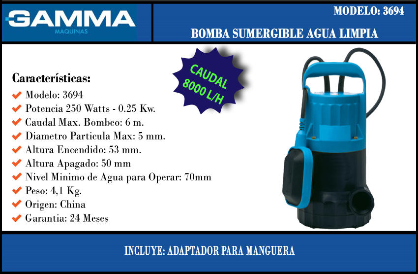 Gamma Bomba Sumergible 250 1/4hp Agua Limp. Plastica