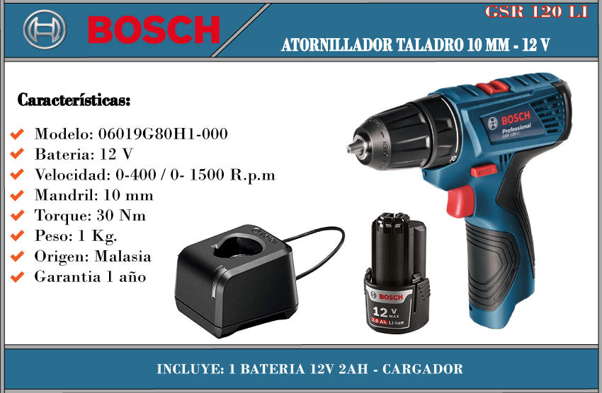Bosch Atornillador Taladro 12v Max 10mm Sin Percutor 1 Bateria Gsr120-li