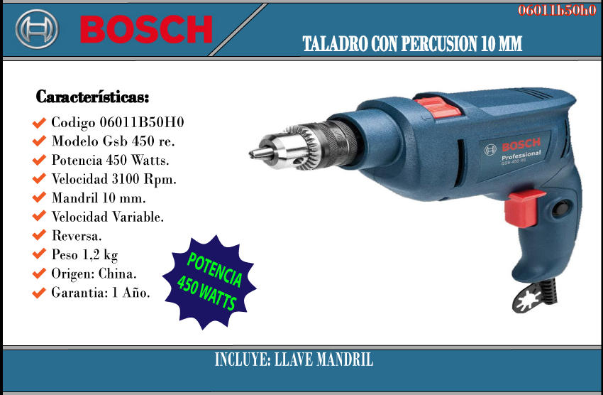 Bosch Taladro 10 Mm Percutor 450 W Gsb 450 Re