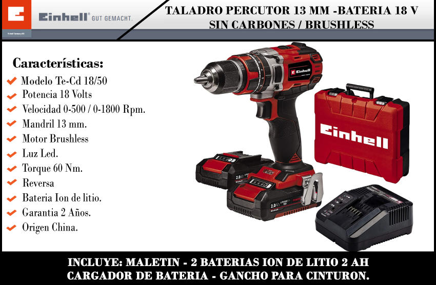 Einhell Atornillador Taladro Percutor 18v 13mm Te-cd 18/50 Sin Carbones (2 Baterias - Cargador - Maletin)