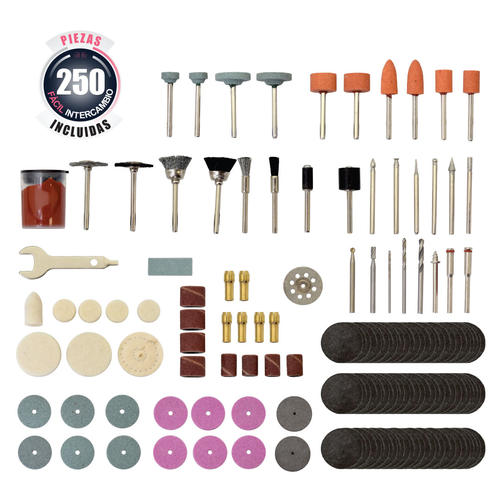 • Incluye Gabetero Plástico - 88 Discos De Corte - 90 Discos Para Lijado - 10 Muelas Para Amolar - 12 Discos Abrasivos - 6 Boquillas (2 De C/u :1,6 Mm, 2,4 Mm, 3,2 Mm) - 2 Ruedas De Goma - 1 Llave - 1 Piedra Para Lijado - 8 Bandas Para Lijado - 3 Cepillos De Nylon - 3 Cepillos De Acero - 2 Vástagos Para Bandas De Lijado - 1 Pasta Para Pulido - 2 Vástagos Para Ruedas De Corte - 1 Vástago Para Rueda De Fieltro - 2 Cortadores Hss - 1 Vástago Con Fieltro - 6 Ruedas De Fieltro - 1 Rueda Del Paño - 1 Disco De Corte De Diamante - 6 Puntas Con Rueda De Diamante -3 Brocas
