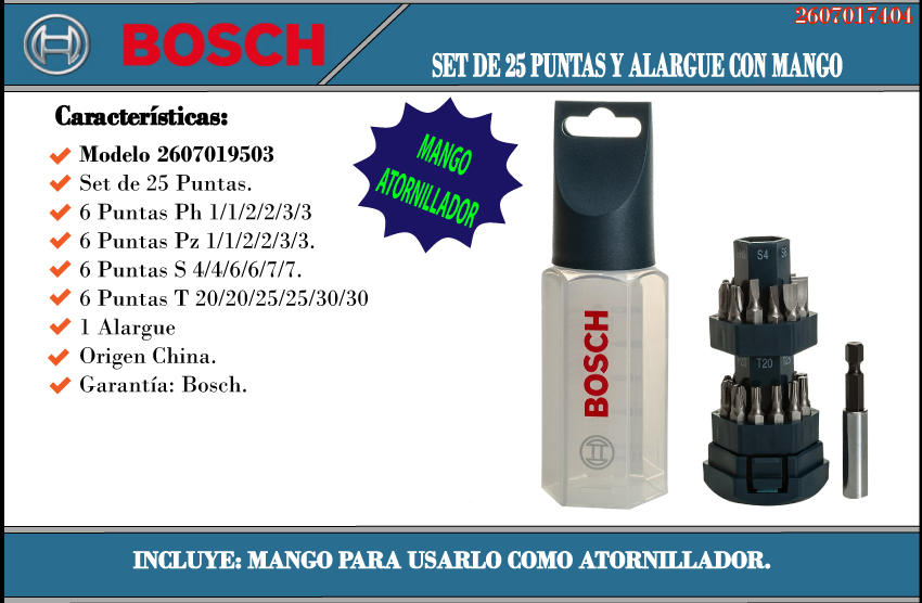 Bosch Set 25 Piezas - Puntas - Ph - Pl - Torx - Prolongador - 017404