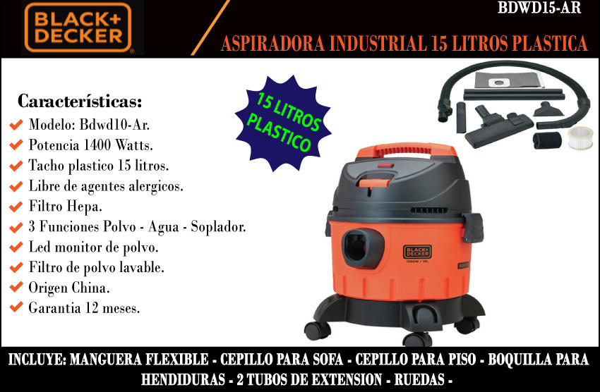 Black & Decker Aspiradora 15 Lts 1400w 220v Seco - Humedo