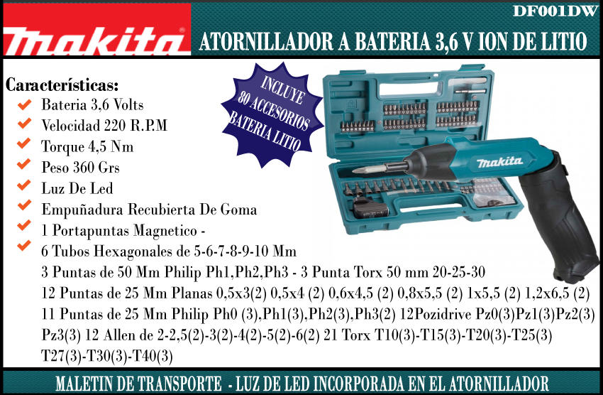 Makita Atornillador 3,6v + 80 Acc Maletin (ex 6723dw 4,8 V)