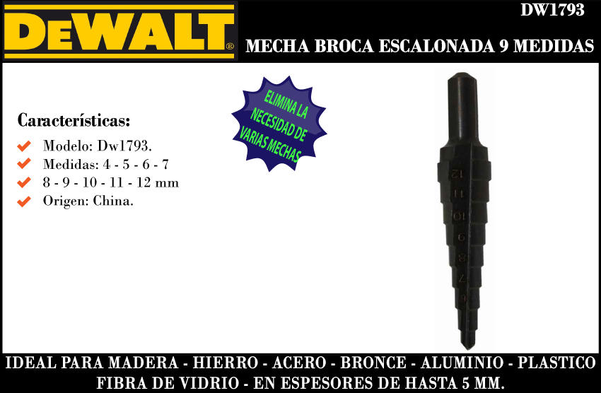 Dewalt Mecha Escalonada 9 Medidas (4-5-6-7-8-9-10-11-12 Mm)
