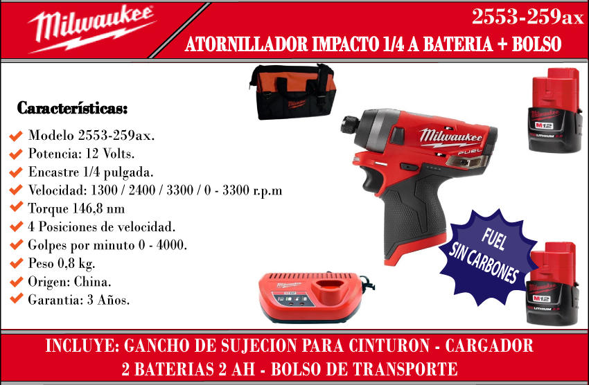 Milwaukee Atornillador De Impacto 12v 2 Baterias 1 Cargador