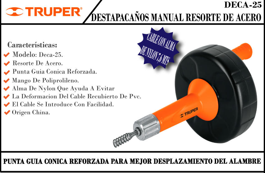 Truper Destapacaños Manual Resorte Acero C/alma Nylon 7,6mts. X 1/4" Esp. (12279)
