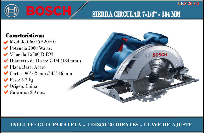 Bosch Sierra Circular 7 1/4 (184mm) 2000 Watts Gks 20-65