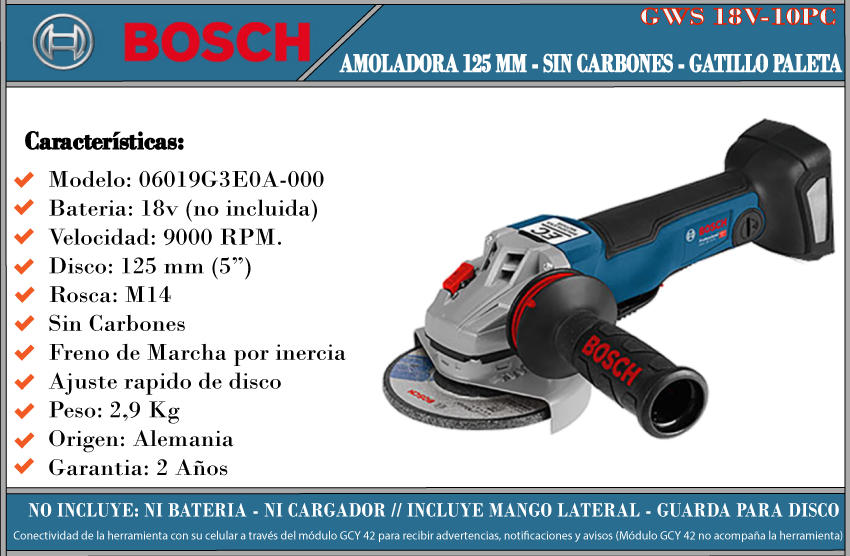 Bosch Amoladora 125 Mm 18v Gws 18v-10 Pc Gatillo Paleta - Brushless (sin Bateria Sin Cargador)