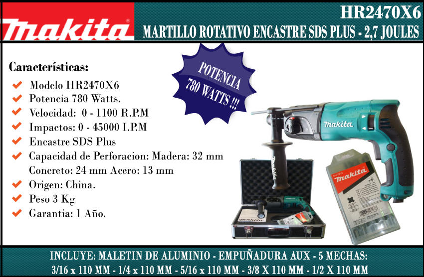 Makita Martillo Rotativo Plus Hr2470x6 780w 2,7j 24mm C/male