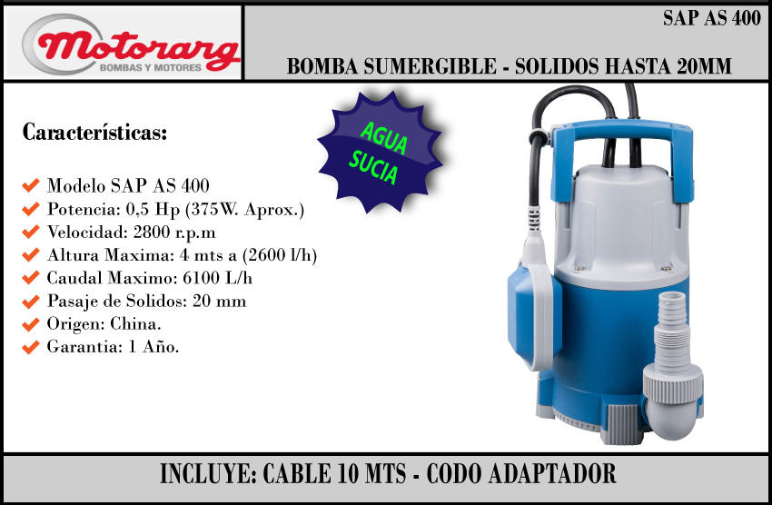 Motorarg Bomba Sumergible Portatil Sapas400 220v 0.5hp Agua Sucia
