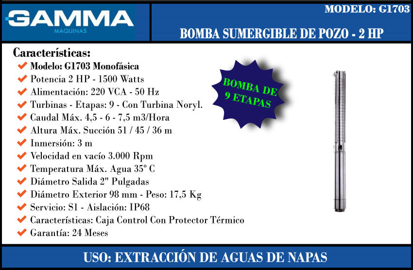 Gamma Bomba Sumergible Pozo Turbina Noryl 2 Hp 9 Etapas
