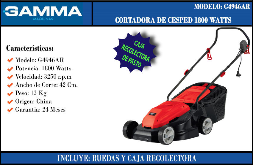 Gamma Cortadora Cesped 1600w Regulacion De Altura 40 Lts