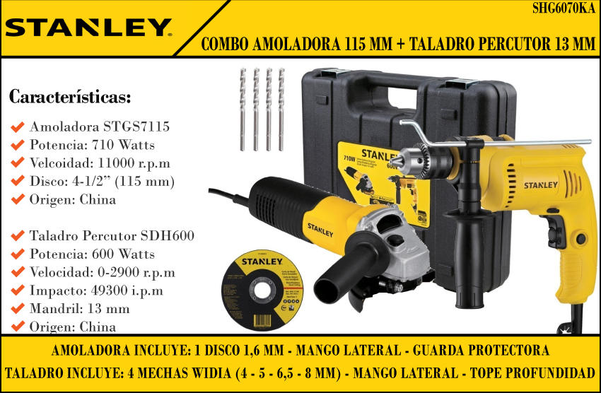 Stanley - Combo Taladro Percutor 13mm + Amoladora 710w 115 Mm + Maletin