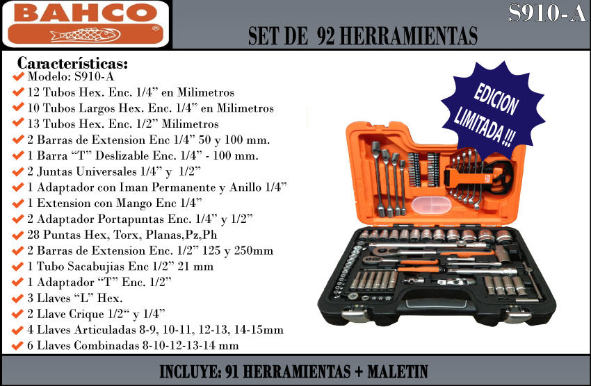 Bahco Set 92 Piezas De Tubo Codigo S910