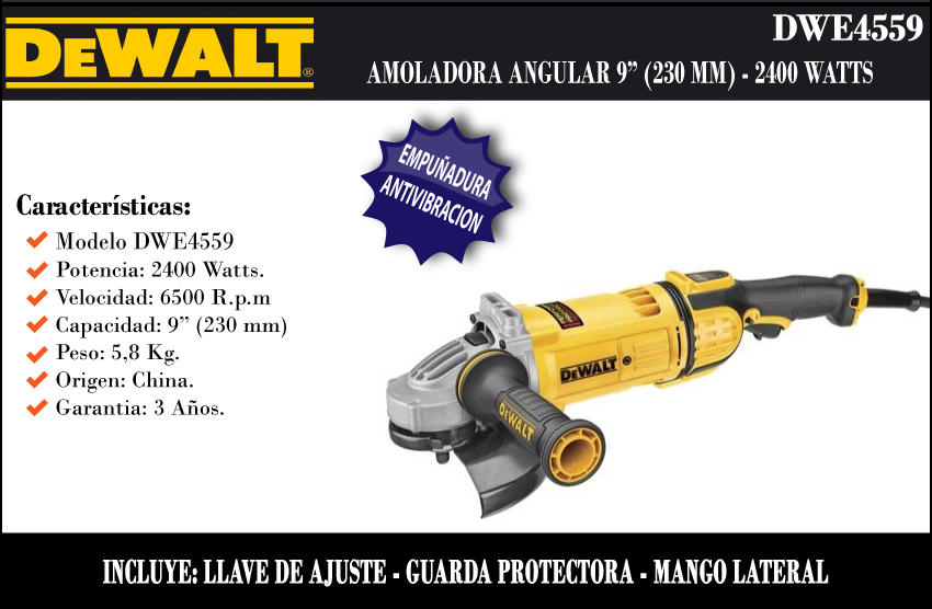 Dewalt Amoladora 230 Mm 9" 2400 Watts Empuñadura Antivibracion