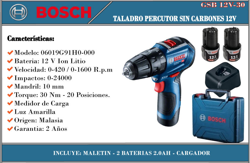 Bosch Atornillador Taladro 12v Max 10mm Con Percutor 2 Baterias Gsb 12v-30