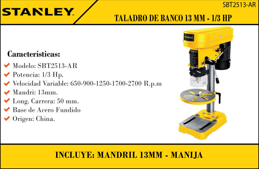 Stanley - Taladro De Banco 13 Mm Log. Carrera 50 Mm
