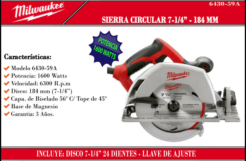 Milwaukee Sierra Circular 7.1/4 1600w Base Magnesio 185mm