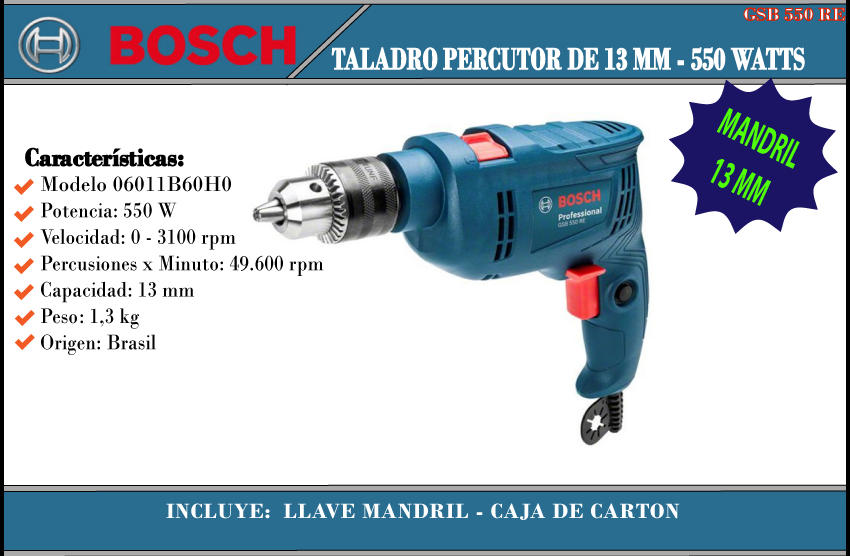 Bosch Taladro 13 Mm Percutor 550 W Gsb 550 Re - S/ Mango - 3100 Rpm