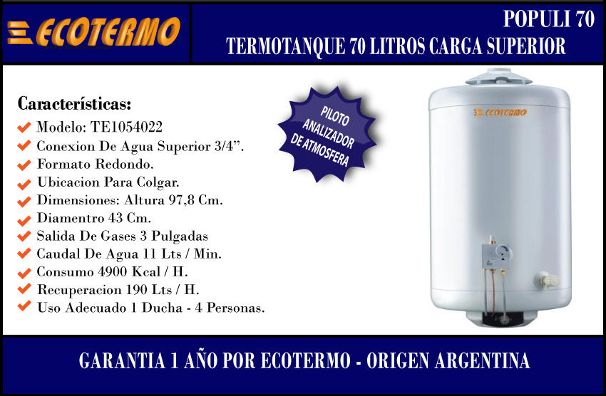Termotanque Ecotermo 70 Lt Populi Gas Natural Carga Superior