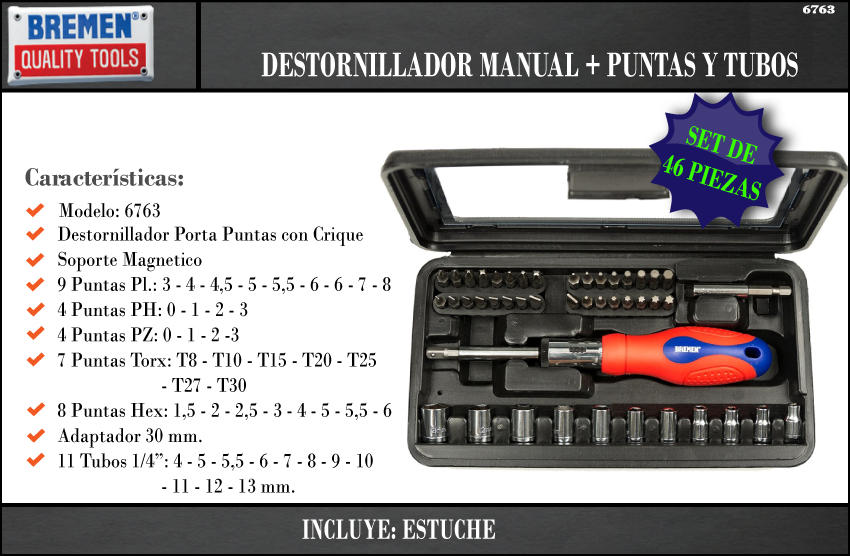 Bremen Set 46 Piezas Atornillador + Puntas Y Tubos