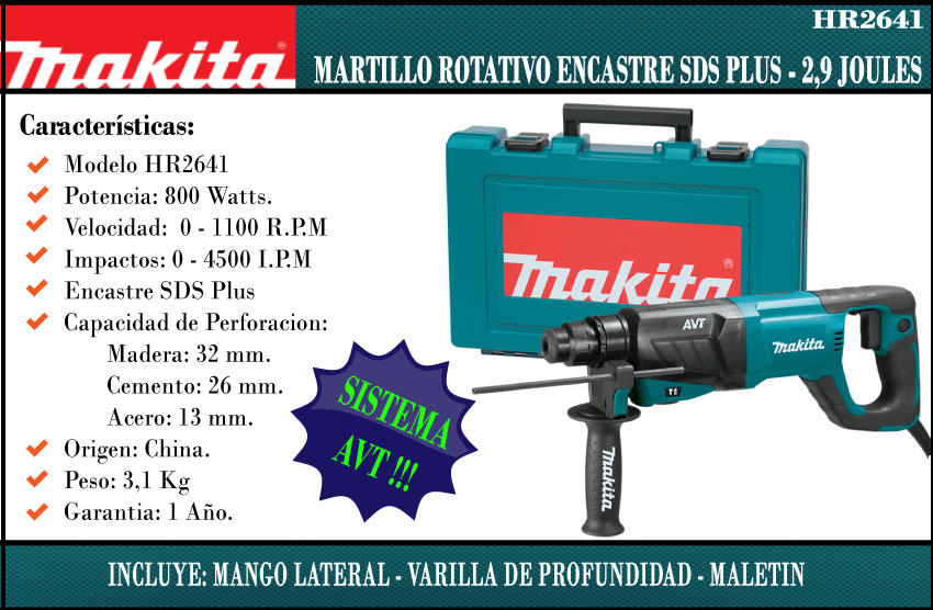 Makita Martillo Rotativo Plus C/ Avt Hr2641 800w 2,9j 26mm 4500gpm