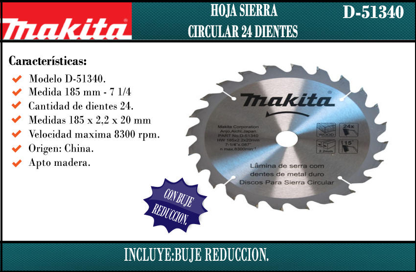 Makita Disco Sierra Circular 71/4" 185mm X 24 Dientes