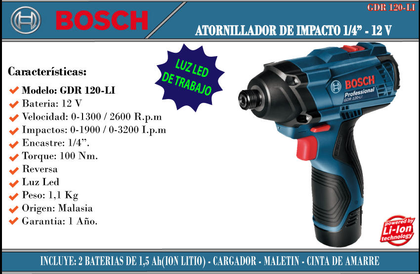 Bosch Atornillador De Impacto 1/4 12v Gdr120-li (2 Baterias - Cargador)