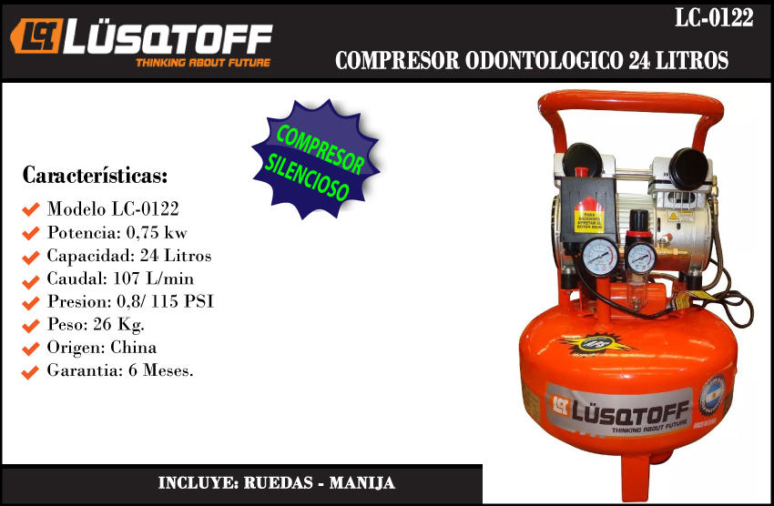 Lusqtoff Compresor 24 Lt Sin Aceite Odontologico 107 L/ Min.