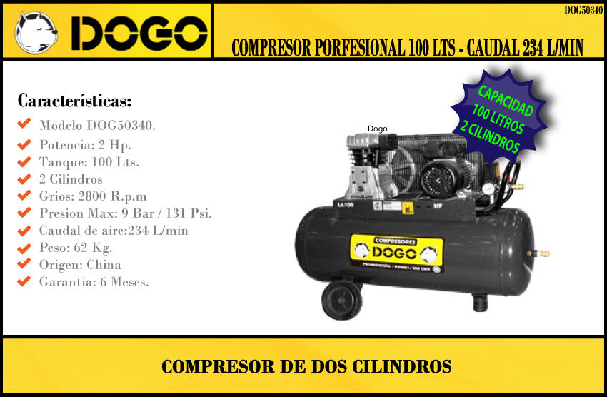Dogo Compresor 100 Litros 2 Hp Bicilindrico Monofasico