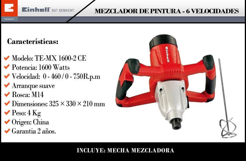 Einhell Mezclador De Pintura Y Cemento 1600w Mecha Espiral 160mm Te-mx 1600-2 Ce