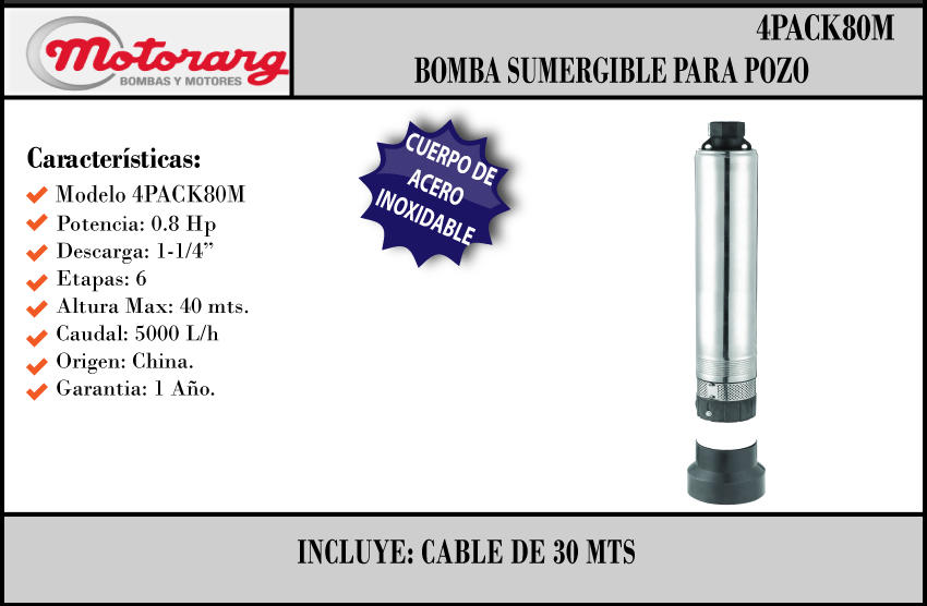 Motorarg Bomba Sumergible Pozo 4pack 80m 220v 0.8hp 6 Etapas 30 Mt Cable