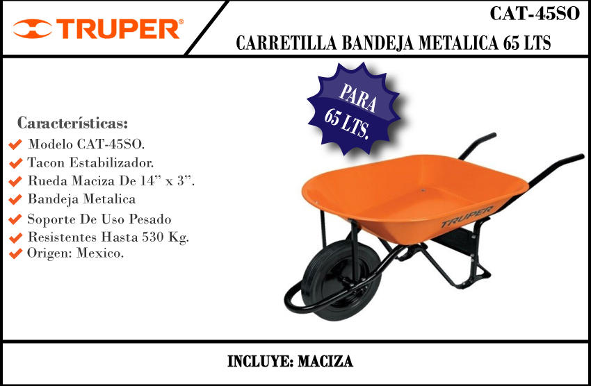 Truper Carretilla Bandeja Metalica 65 Lts. Naranja Rueda Maciza(11744)